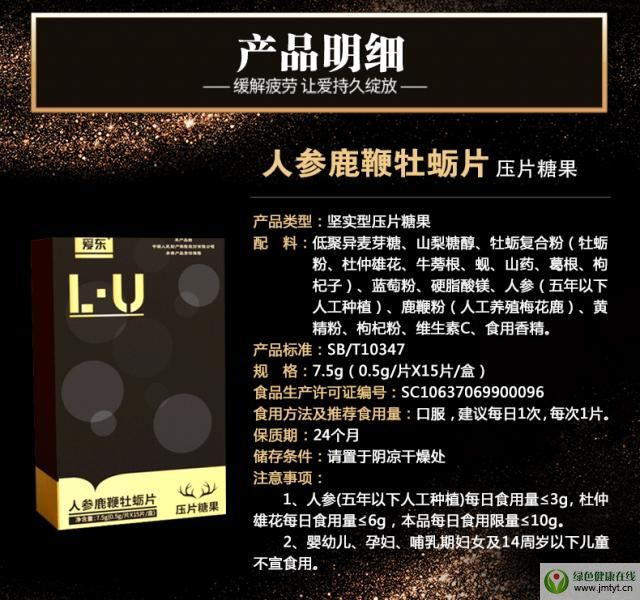 配料:低聚異麥芽糖、山梨糖醇、牡蠣復合粉(牡蠣粉、杜仲雄花、牛蒡根、蜆、山藥、葛根、枸杞子)、藍萄粉、硬脂酸鎂、人參(五年以下人工種植)、鹿鞭粉(人工養殖梅花鹿)、黃精粉、枸杞粉、維生素C、食用香精。