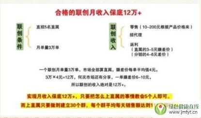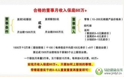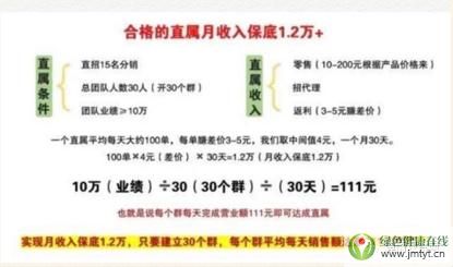 團購價銷售,分銷價報單,利潤當天結算,可以說是每日收入秒結;第2部分的收入:就是代理單的返利。你推薦的直接代理,如果她每天接了單,她的每一單,你都有1元到2元不等的返利,不要小瞧這個1-2元,單一多了,這個返利是很可觀的;第3部分的收入:就是直屬收入。如果你能夠在某一個月里面,帶著以你為原點的團隊做到10萬的業績,并且你的直接推薦的代理人數達到15位以上,你的整個團隊人數達到30人以上,那么,你就會升到一個級別,叫“直屬”。
